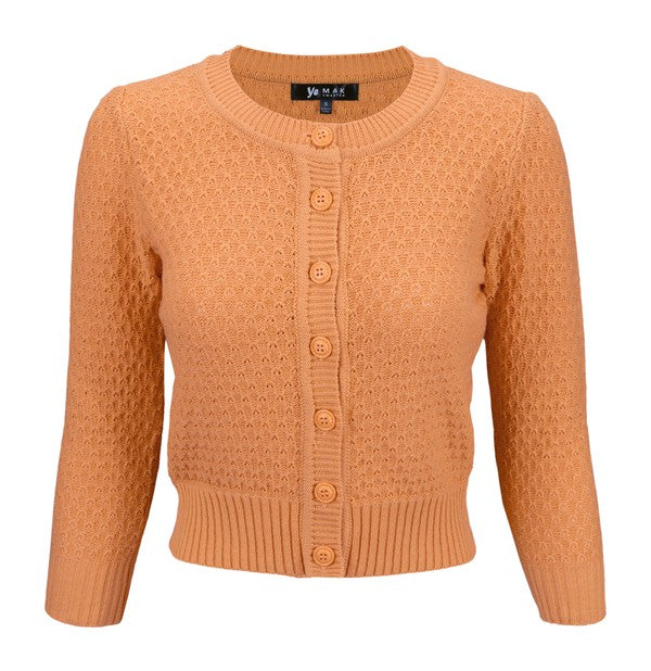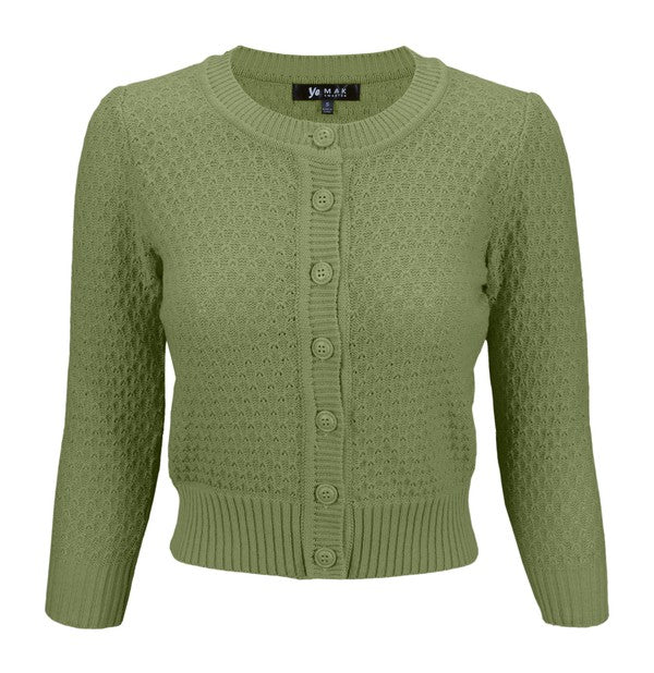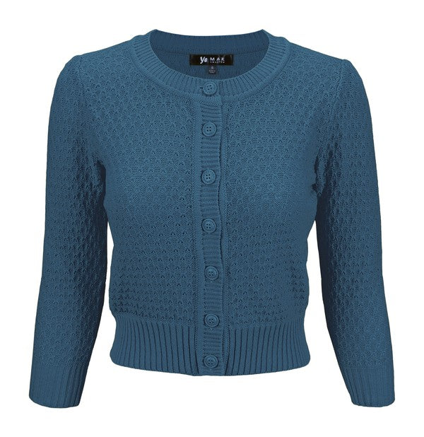 -17.5"-19" Crop Length, 3/4 Sleeves, Round Neck Knit Cardigan Sweater with Adorable Vintage Buttons All the Way Up to the Crew Neckline, Ribbing Detail at Collar, Cuffs, and Hem.