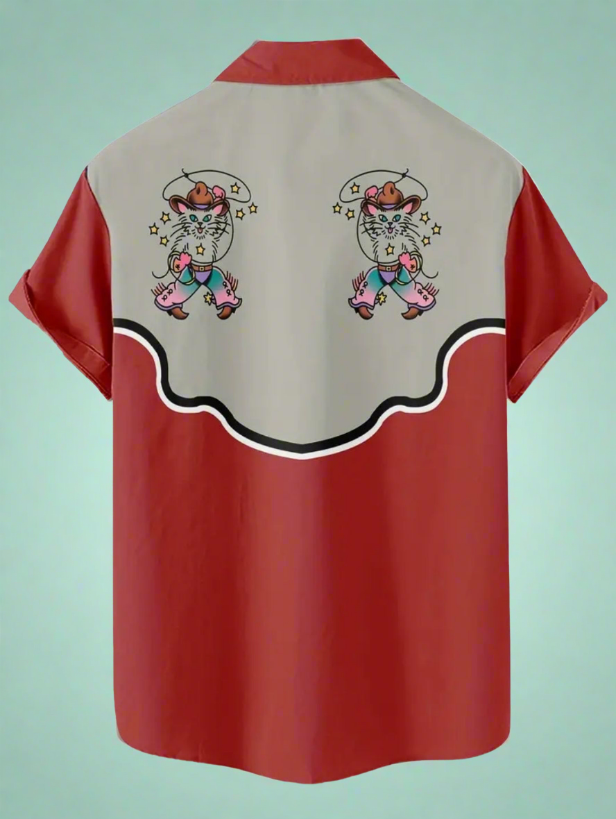 Retro Western Cowboy Cat Print Button Up Shirt