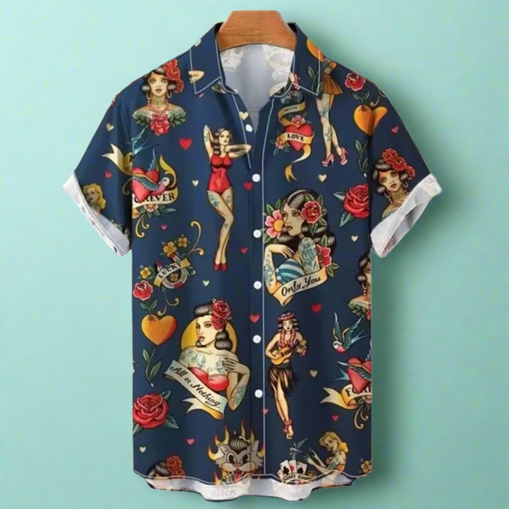 Rockabilly Tattoo Pinup Girl Navy Button Up Shirt