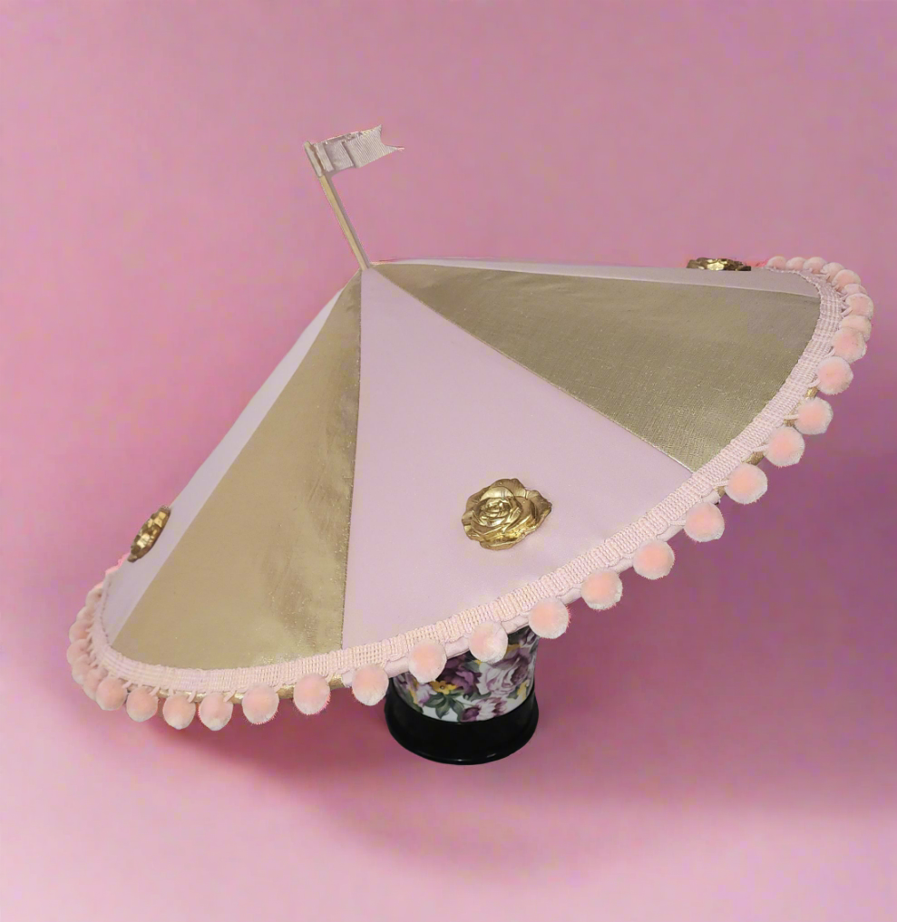 Step right up and join the greatest show on earth with our Big Top Circus Tent Carnival Hat by Hollyville! Handmade by Pamela Marie, this hat features alternating pink satin and metallic gold lamé panels, fantastical pink pom pom trim, and gold rose medallions, and fastens with two alligator clips, perfect for your entertaining performances. Measuring 17"d x 7"h, it'll surely blow your top as the star of the show!