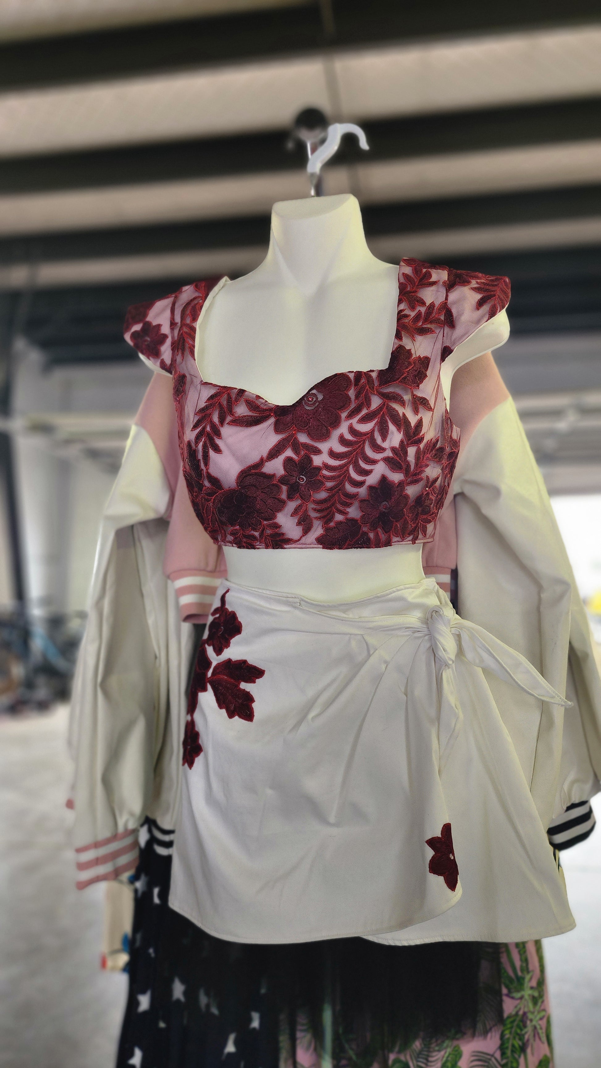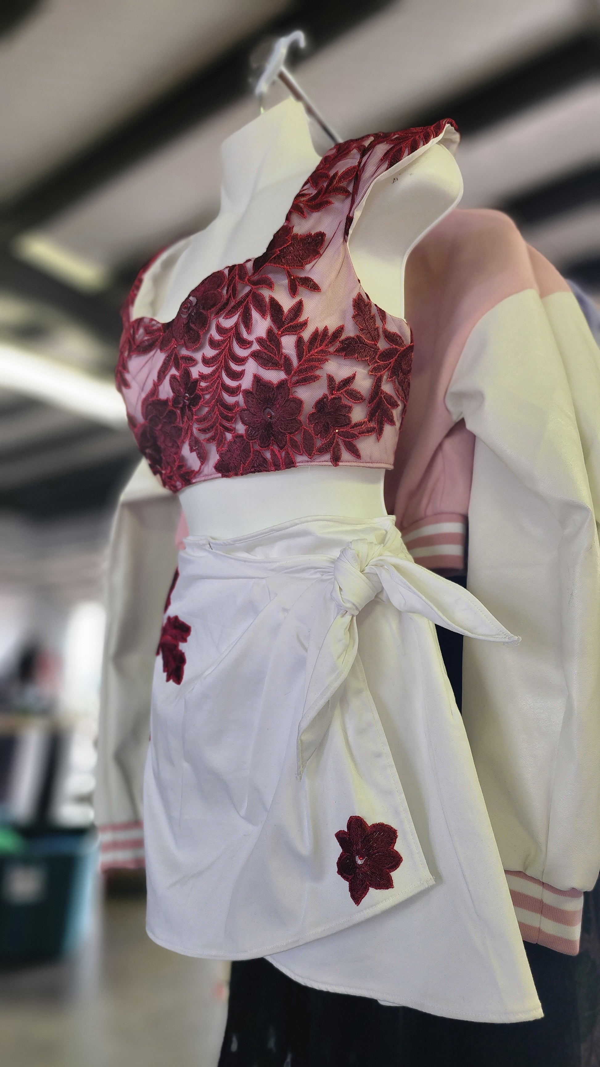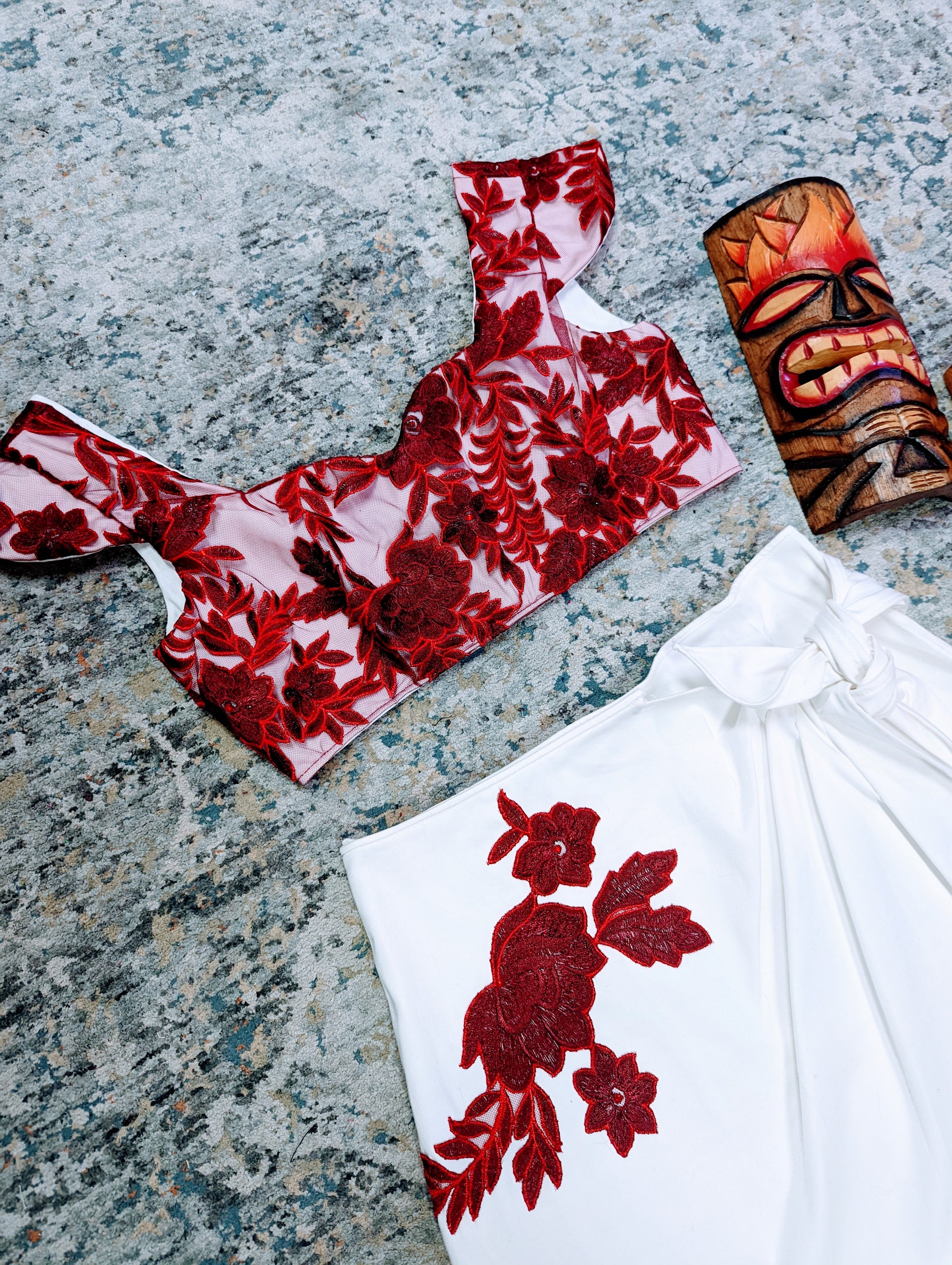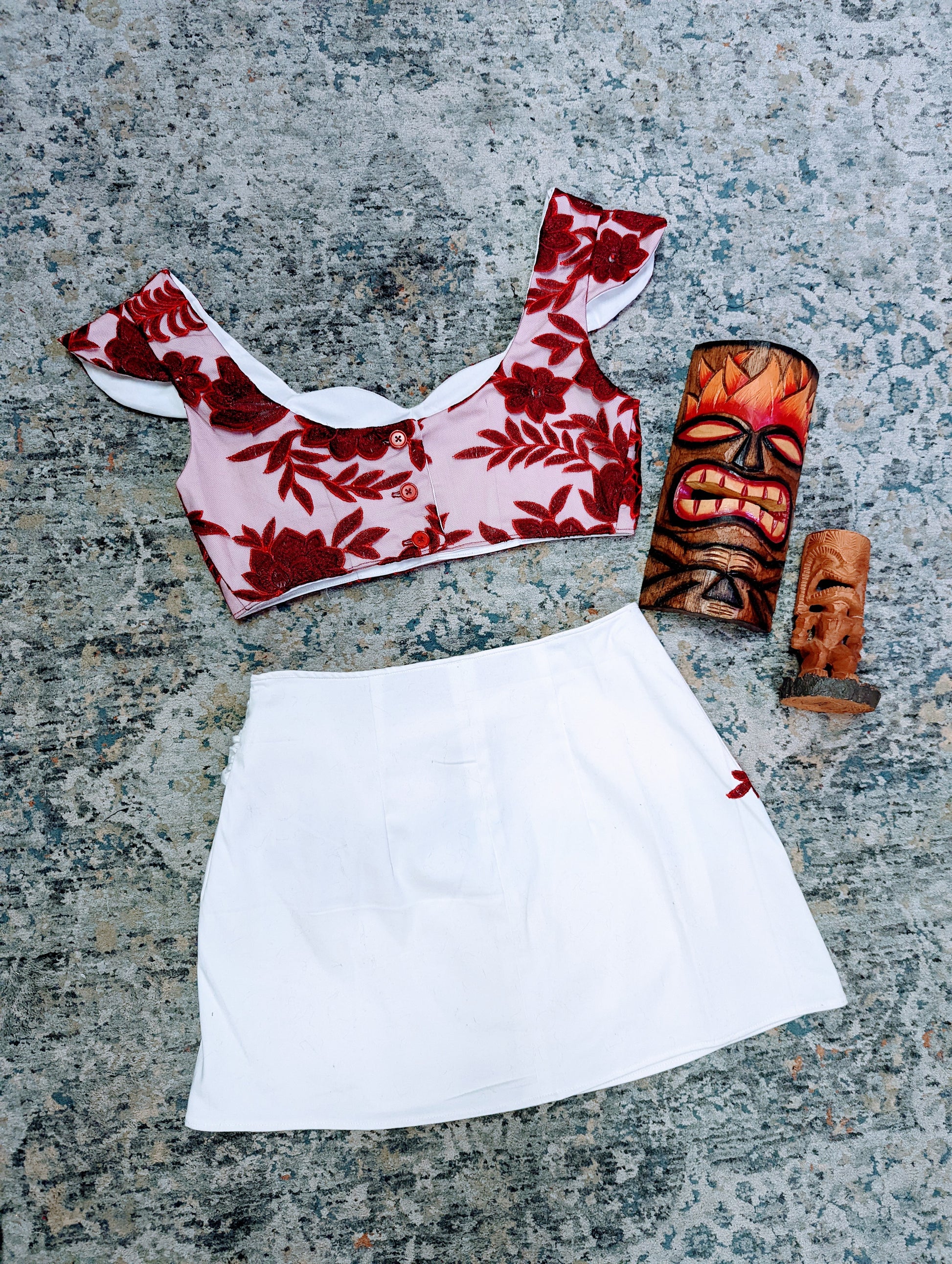 White cotton sateen with red lace overlay crop top with 3 button closures on the back. Matching white cotton sateen sarong skirt with red lace applique and a snap and tie closure. Made and stitched by hand by owner of Hollyville, herself.